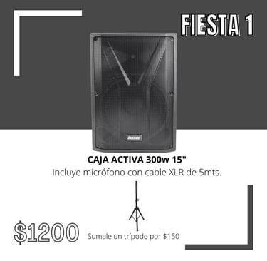 Incluye 1 caja activa de 300W 15” + micrófono con cable XLR de 5 metros.